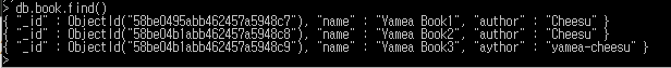 > db.book.insert({"name": "Yamea MongoDB", "author": "cheesu"}); |