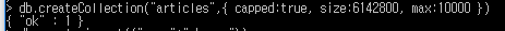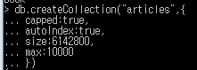 > db.createCollection("articles", {capped: true, size: 6142800,max: 10000)} |