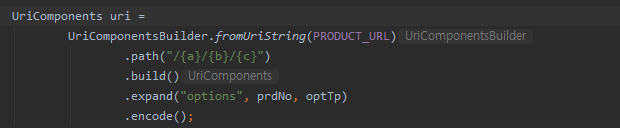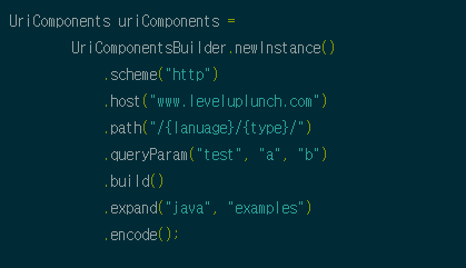 URI를 동적으로 생성해주는 클래스다. 파라미터가 조합된 URI를 손쉽게 만들어 주어서 코드상에서 직접 문자열을 조합할 때 생기는 실수를 방지할 수 있다.