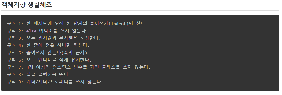 지금까지 다룬 9가지 규칙 가운데 8가지는 간단히 말해 객체지향 프로그래밍이라는 성배(Holy Grail), 즉 데이터의 캡슐화를 가시화하고 실현하기 위한 방안이다. 더불어, 또 하나는 다형성의 적절한 사용(else를 쓰지 않고 모든 조건 논리를 최소화하는 것)을 유도하며, 또 하나는 간결하고 직설적인 명명 표준을 장려하는, 일관성 없이 적용되며 발음하기 어려운 축약어를 배제한 명명 전략이다.