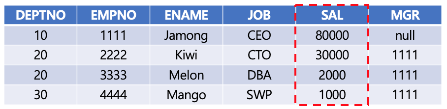 SUM(SAL)        --> 분석함수 SUM을 사용했고 SAL 칼럼에 대한 행들이 행 그룹입니다.