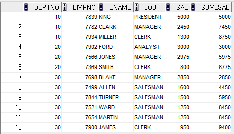,SUM(SAL) OVER(PARTITION BY DEPTNO ORDER BY SAL DESC) AS SUM_SAL